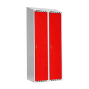 Helsvetsat SMG klädskåp med rakt eller sluttande tak. Klädskåpet har ljusgrå färg RAL7035 och 1 dörr i höjd. Skåpet levereras färdig med cylinderlås eller klinka för hänglås monterat i dörrarna.