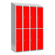 Helsvetsat SMG klädskåp med rakt eller sluttande tak. Klädskåpet har ljusgrå färg RAL7035 och 2 dörrar i höjd. Skåpet levereras färdig med cylinderlås eller klinka för hänglås monterat i dörrarna.