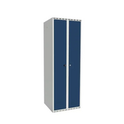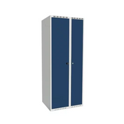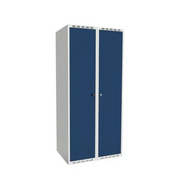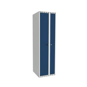 Helsvetsat parskåp med plant tak. 2 dörrar med parlås. Ljusgrå stomm. Levereras med färdigmonterad cylinderås eller klinka för hänglås i skåpets dörr. Inredning med hatthylla samt klädstång med hatthylla samt klädstång med 2 st. ankarkrokar. Inbyggd ventilation i skåpets över och underkant.