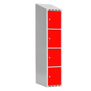 Helsvetsat SMG klädskåp med rakt eller sluttande tak. Klädskåpet har ljusgrå färg RAL7035 och 4 dörrar i höjd. Skåpet levereras färdig med cylinderlås eller klinka för hänglås monterat i dörrarna.